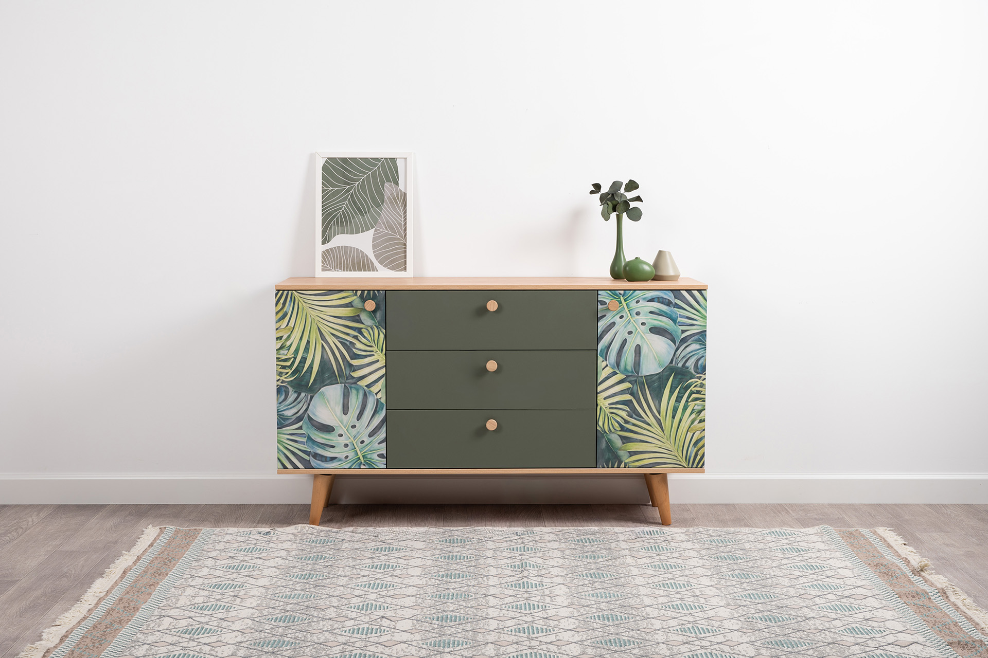 Обратите внимание на элегантный комод на ножках — такая модель визуально облегчает интерьер, упрощает уборку под мебелью и добавляет воздушности комнате. Классикой остается деревянный комод или его качественная имитация из ЛДСП и МДФ, обеспечивающих долговечность и натуральный вид. Практичным и удобным будет комод с ящиками — от 4 до 8 штук, с плавными направляющими для бесшумного открывания.