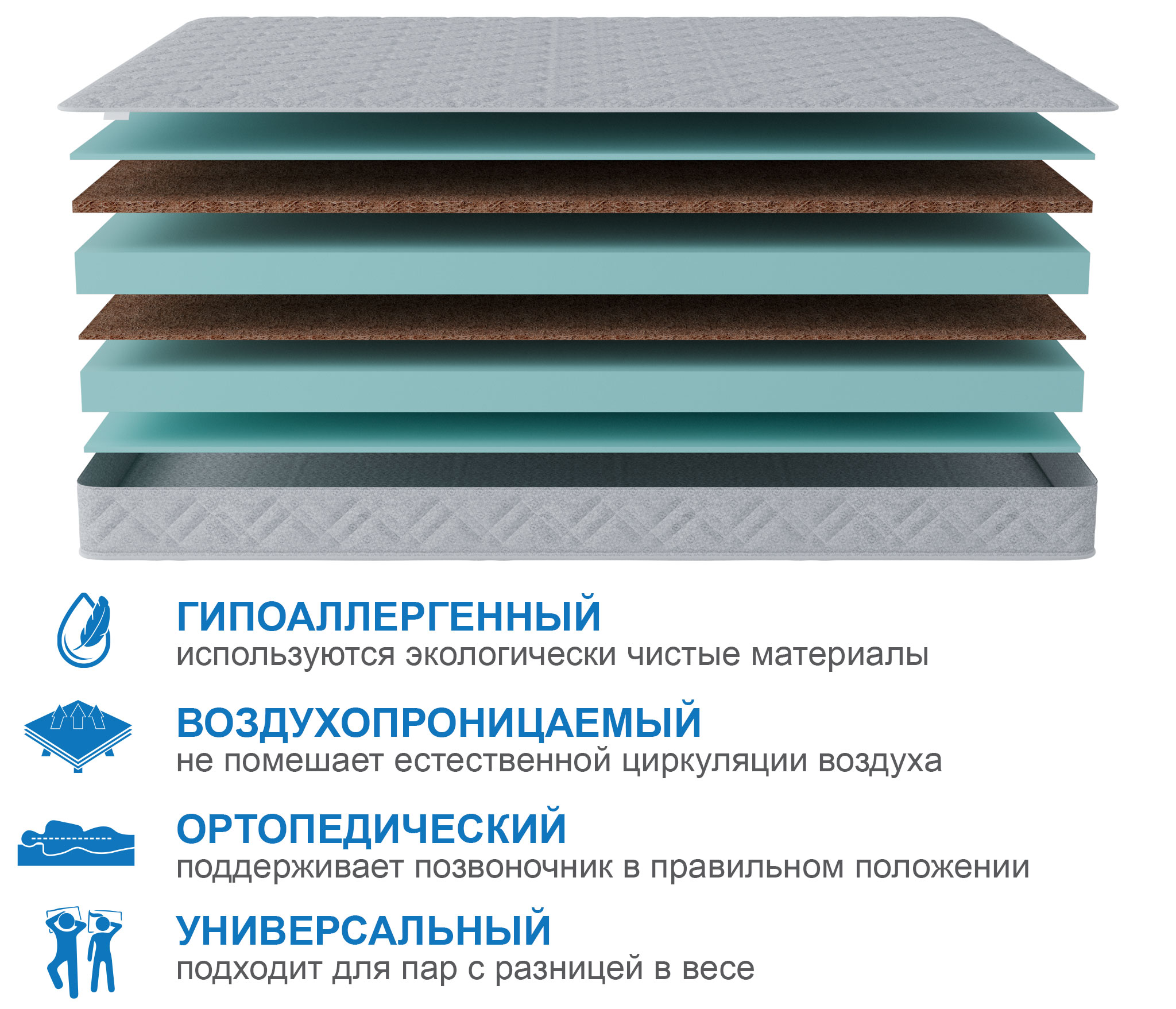 Наполнитель: Латексированные листы кокосовой койры 30 и 10 мм, 2 листа ППУ 750 мм