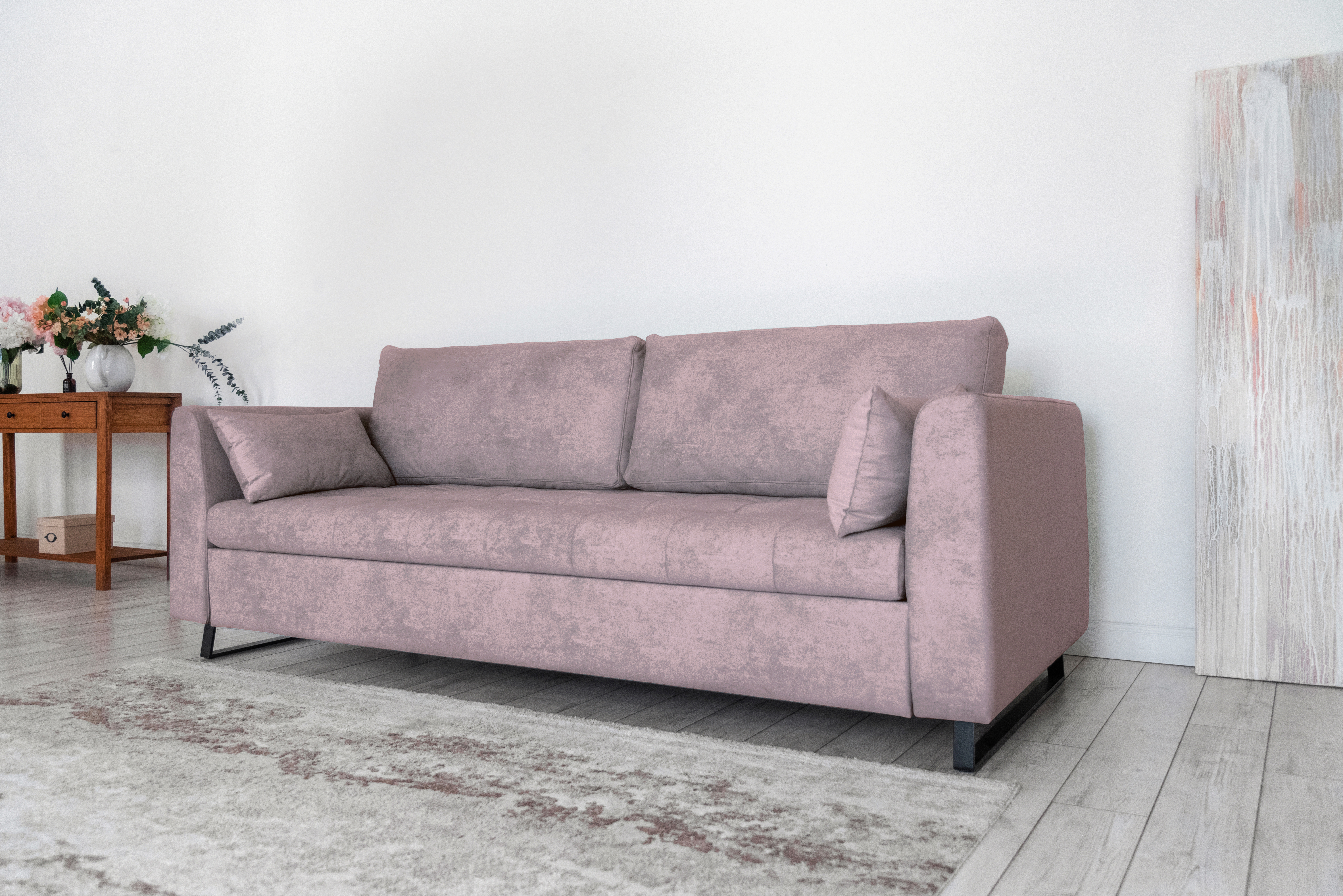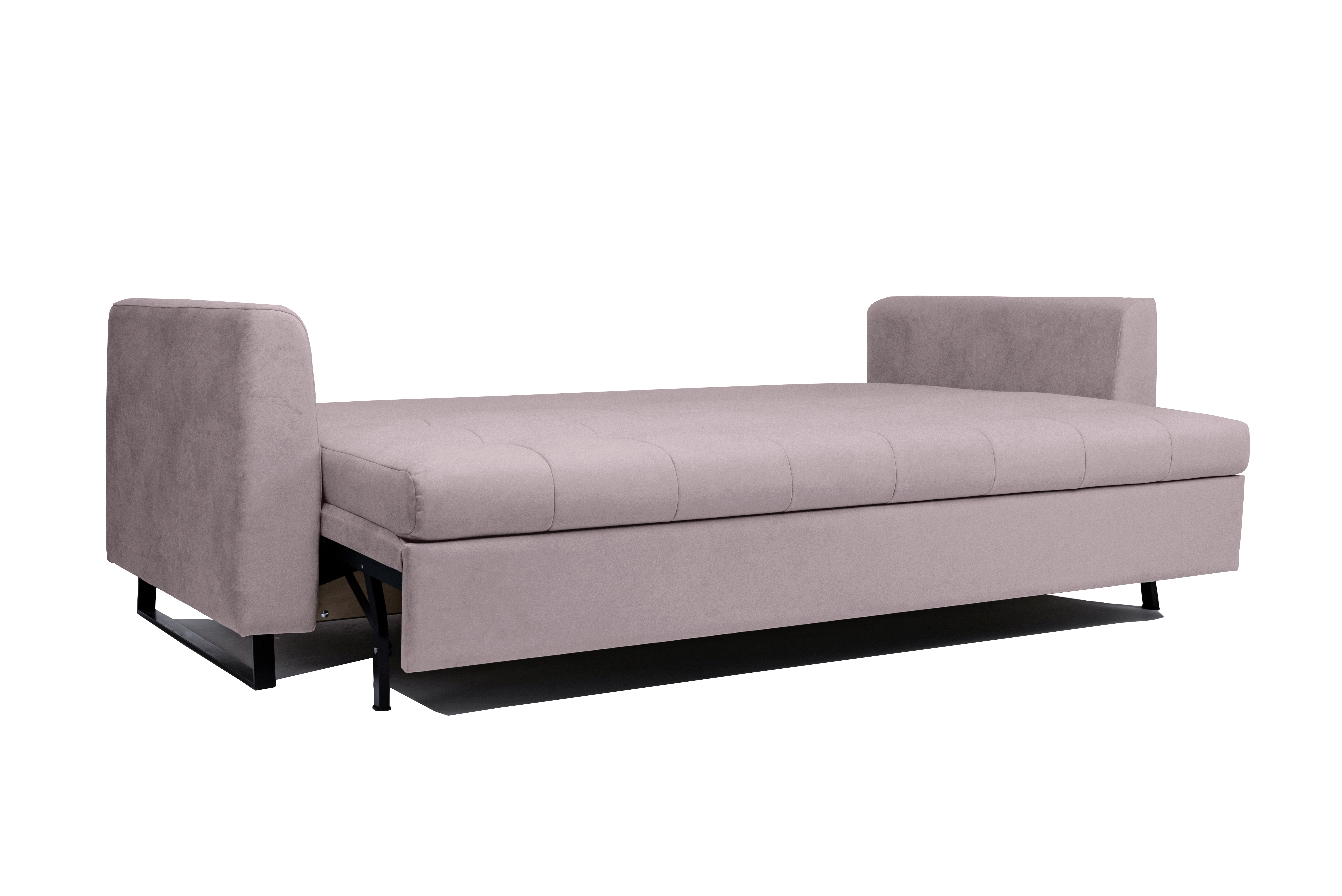 Механизм трансформации — шагающий (пантограф). Что позволяет использовать этот диван вместе с высокими коврами, и значительно упрощает раскладывание.