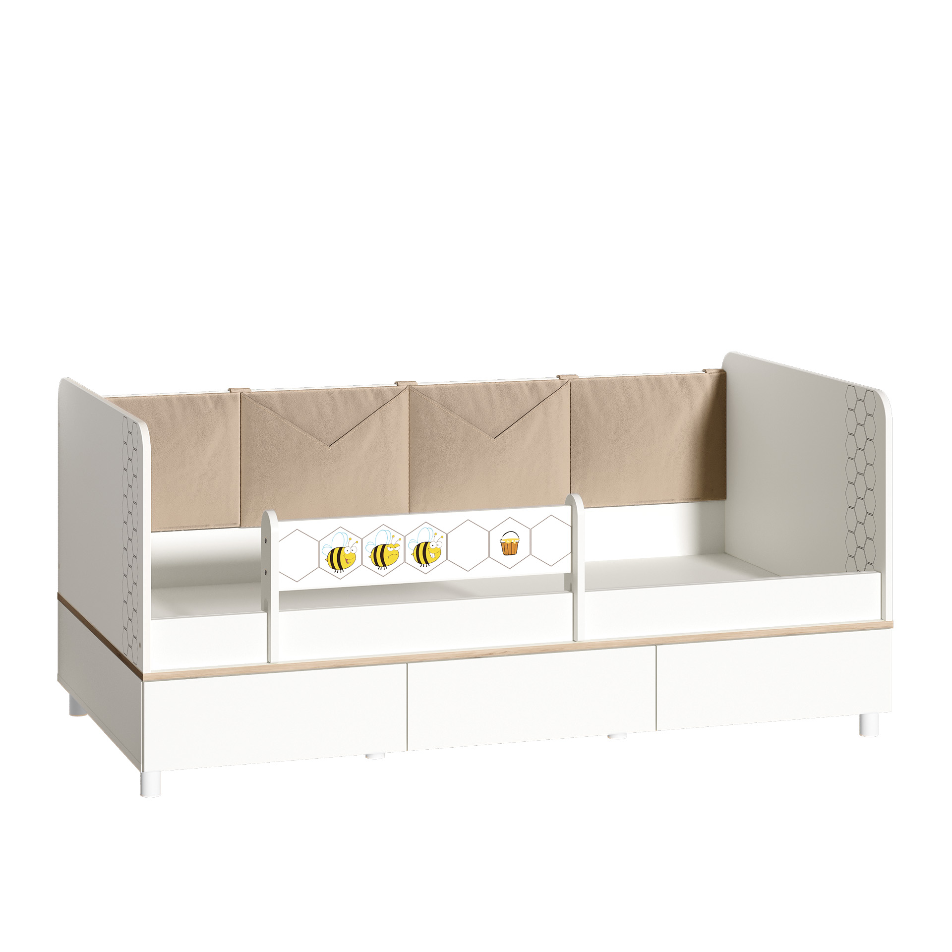 Прелестная кровать с ящиками выполнена в виде удобного диванчика — мягкая задняя спинка, скругленные подлокотники из ЛДСП. Спальное место — 900х2000 мм. Основание под матрас (настил ЛДСП 16 мм.) в комплекте. Матрас для кровати необходимо приобретать отдельно. Рекомендуемая максимальная высота матраса — 200 мм. Задняя стенка кровати с ящиками Вуди 11.02 изготовлена из практичной, модной ткани — рогожка Savana Latte и декорировано удобными карманчиками для аксессуаров. В основании кровати оборудованы два выдвижных ящика для постельных принадлежностей и личных вещей ребёнка. Ящики достаточно вместительные и установлены на колесные опоры, что обеспечивает им легкое выдвижение.