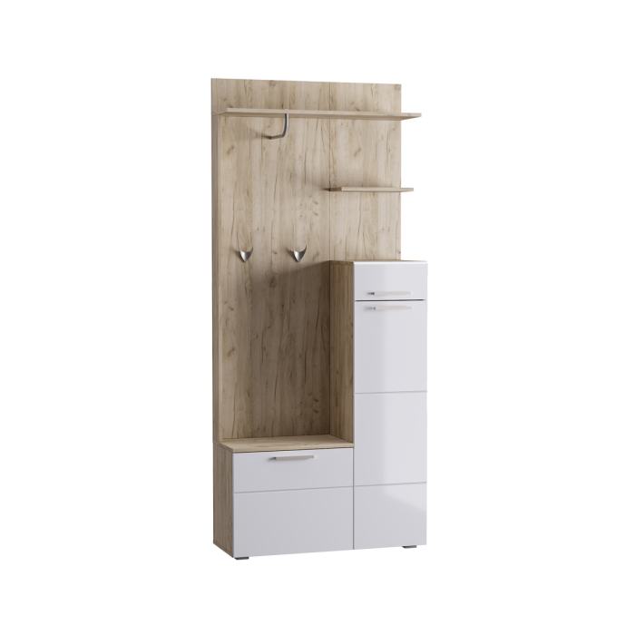 Стильная и современная прихожай Лайн с глянцевыми фасадами впишется в любую прихожую. Изделие оснащено крючками для верхней одежды, антресольной полкой, тумбой для обуви и комодом. Корпус ЛДСП 16 мм, фасад МДФ 16 мм.