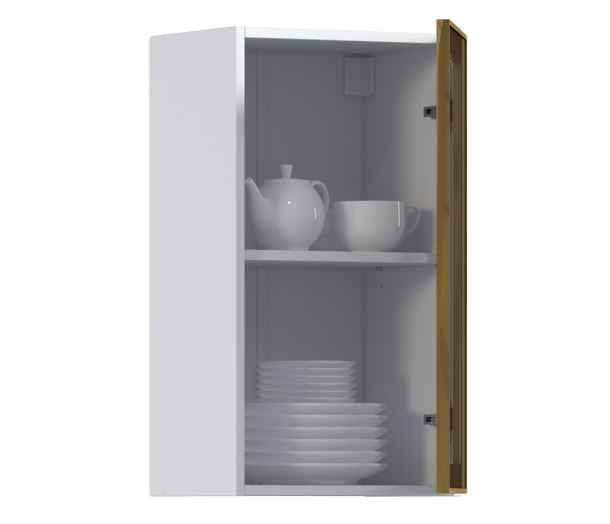 Комплект включает в себя корпус кухонной полки (белого цвета) с необходимой фурнитурой, фасад из алюминиевой рамки золотого цвета и бронзового стекла, а также ручку, соответствующую цвету рамки фасада.