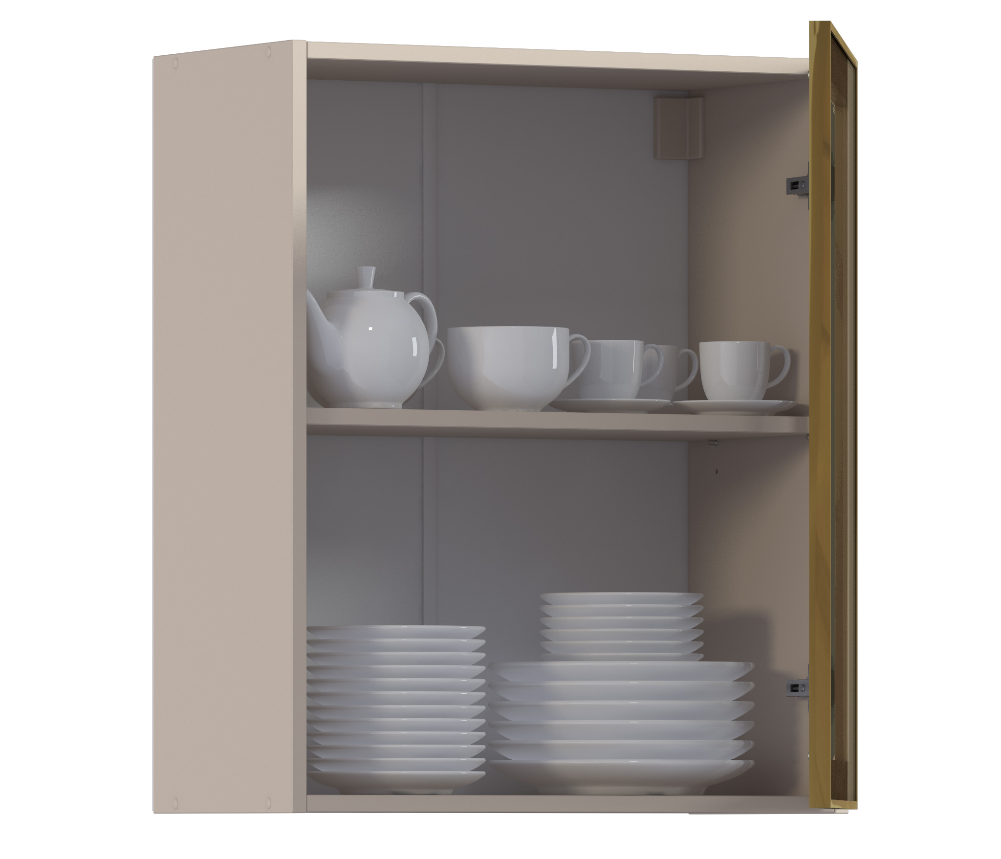 Комплект включает в себя корпус кухонной полки (песочного цвета) с необходимой фурнитурой, фасад из алюминиевой рамки золотого цвета и бронзового стекла, а также ручку, соответствующую цвету рамки фасада.