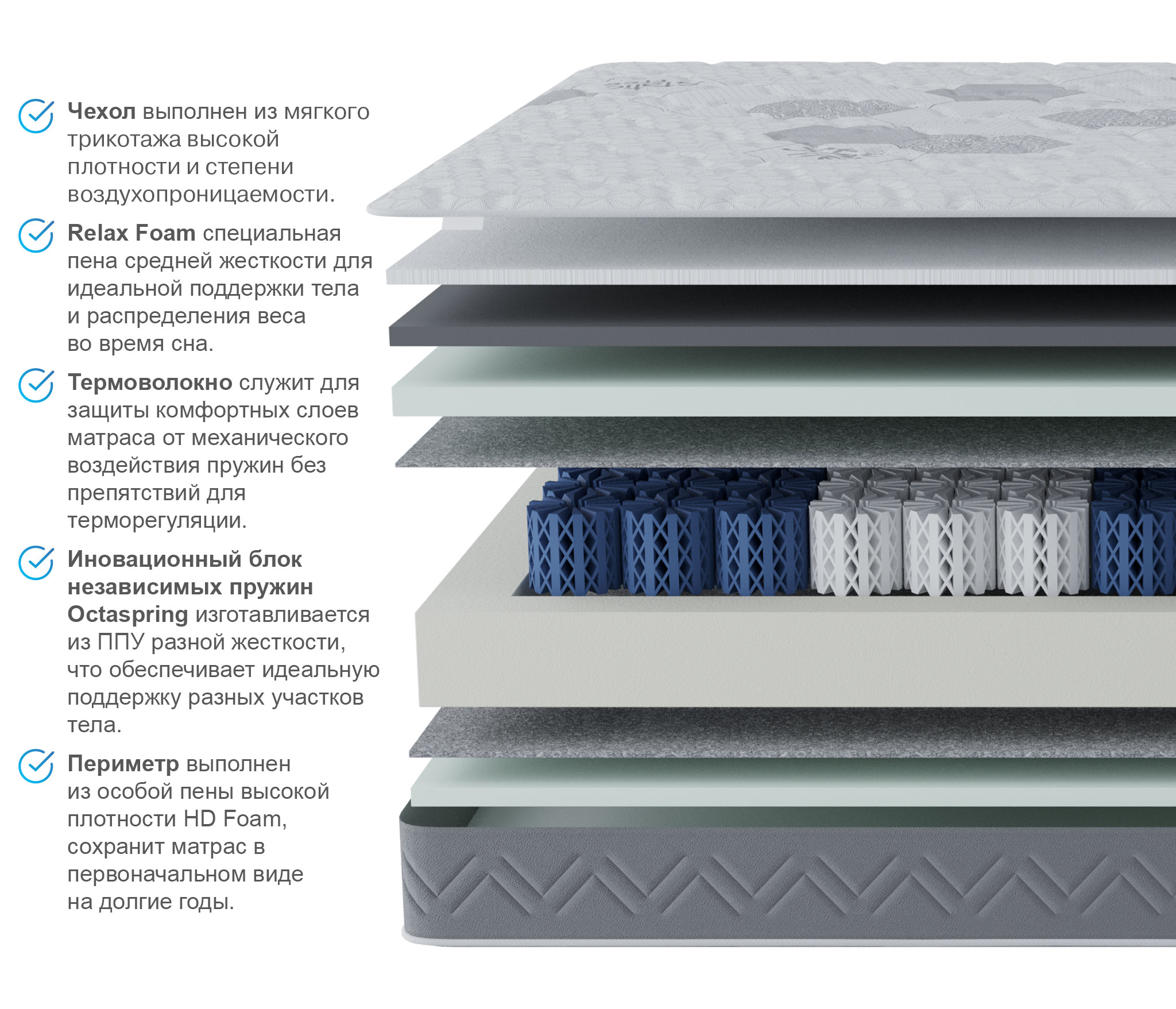 В основе матраса пенные пружины Octaspring высотой 10 см, что позволяет максимально ощутить мягкую динамичность пружины и ее индивидуальную работу. За счет этого увеличивается фаза глубокого сна и значительно снижаются нежелательные пробуждения, влияющие на восстановление организма.