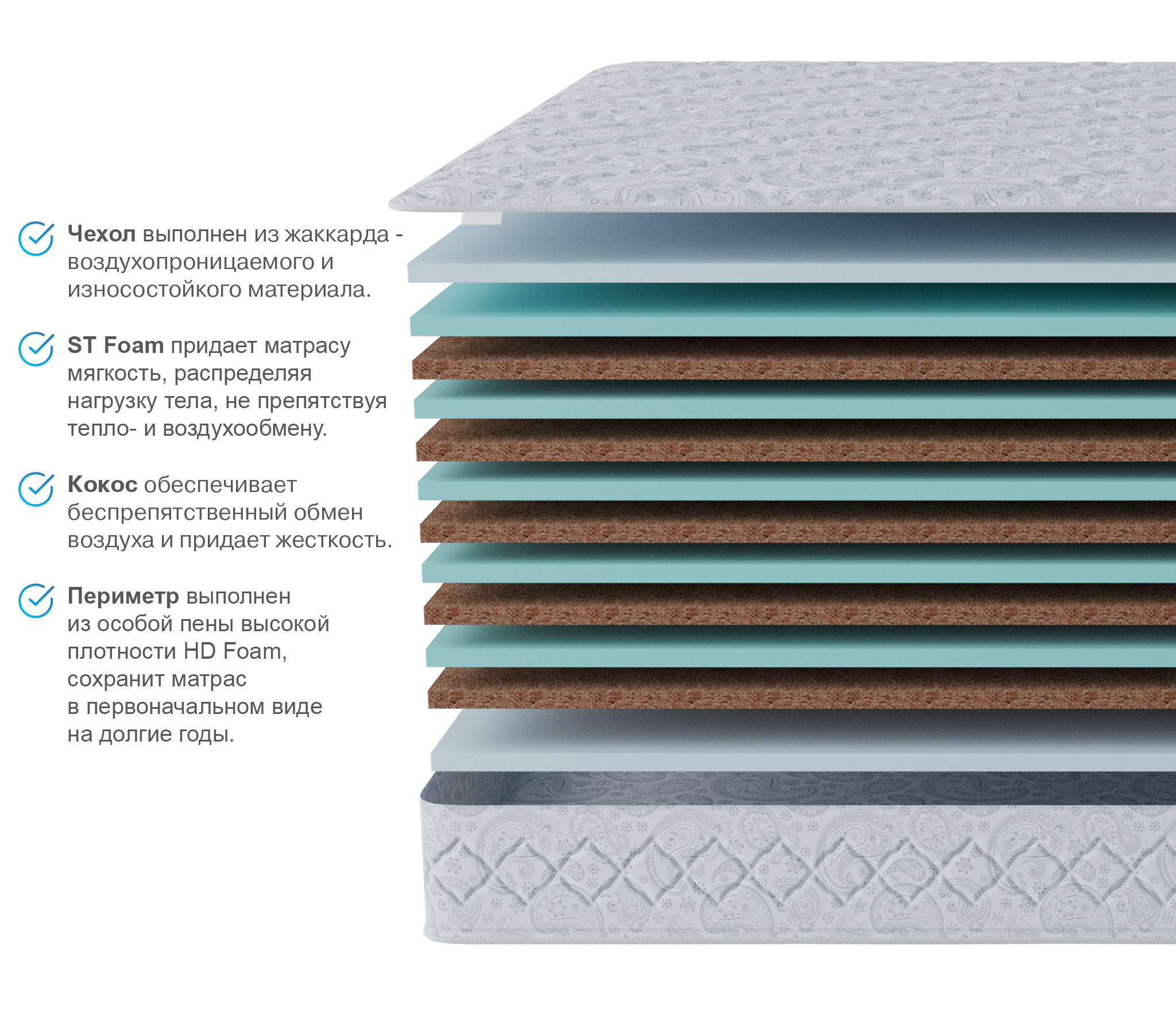 отличный выбор для людей с весом выше среднего. Это жесткий беспружинный матрас, в состав которого входят как искусственные, так и натуральные материалы. В качестве наполнителя матраса используются 5 слоев латексированной кокосовой койры. Это натуральный материал на основе кокосового волокна, пропитанного натуральным латексом, а также листы высокоэластичной пены. Оба материала жесткие, упругие и очень долговечные. При этом матрас подходит для кроватей с подъемным механизмом. Это идеальный матрас для людей желающих поправить здоровье, улучшить сон и уменьшить боли в суставах. При выборе матраса следует помнить о том, что любой матрас не отвечает за правильность положения головы и шеи, их здоровье зависит от правильно подобранной ортопедической подушки. Для увеличения срока службы матраса рекомендуется его использование с защитным чехлом AquaStop.